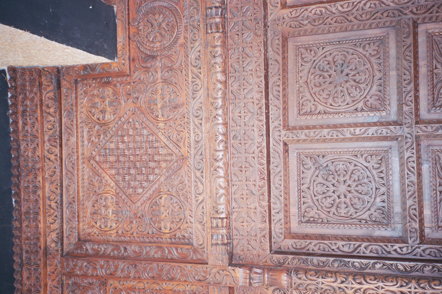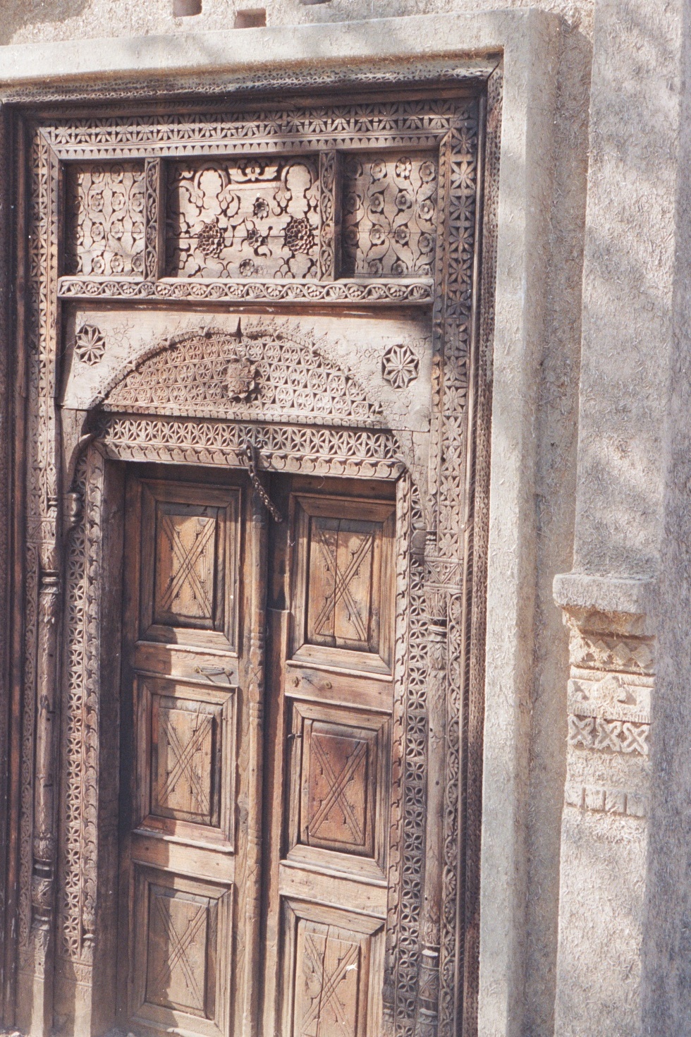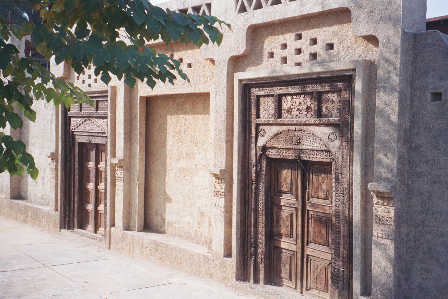 In the yard are placed modes of transport, decorated in the local style, including the very distinctively painted trucks of Pakistan. As I wait for my deliciously hot tea to cool to a drinkable temperature, I wander the yard with my camera. Other structures in the compound replicate the simple mud houses of the North Indian (North South Asian?) plains, not an unusual fashion for such complexes in the region. In fact, the act of choosing to replicate everyday structures and styles in museums is a political choice to move away from the imposing structures in which colonial rulers housed their exotic war spoils and state gifts. But again, I get ahead of myself. What I wanted to write about are the beautiful wood-carved doors at the Lok Virsa museum.
